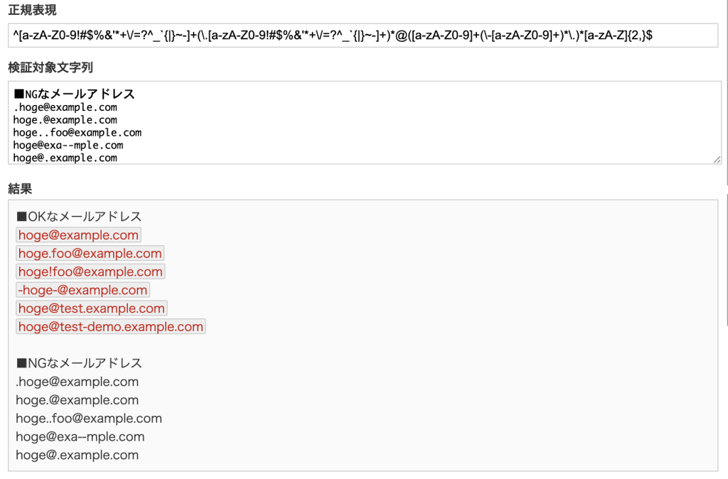 そのため、local-part部としては使える文字種類であげた1.と2.を考慮すれば最低限の一般利用範囲をカバーできると考える。 よって、次の正規表現を検討する。
