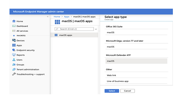 [アプリケーションの種類の選択] ブレードにて、[Microsoft Defender ATP]>[macOS] を選択して [作成] をクリックします。